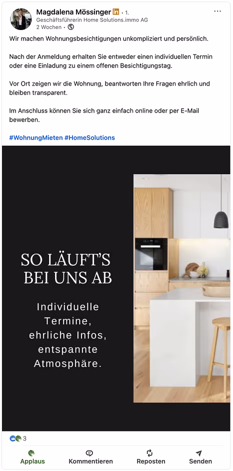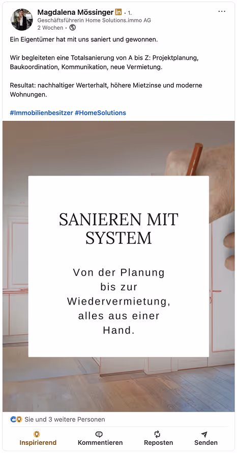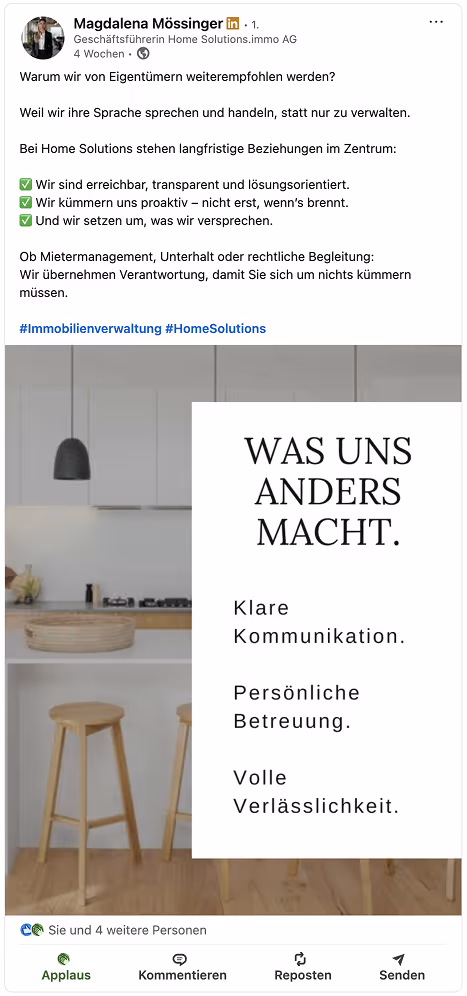 Sa présence marquante sur les réseaux sociaux a très vite attiré l’attention, inspiré confiance et séduit des clients – un vrai levier pour décrocher de nouveaux mandats et générer du chiffre d’affaires.